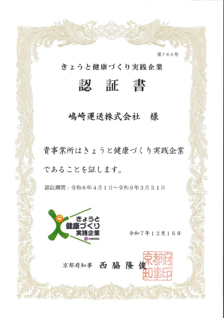 嶋崎運送株式会社は、経済産業省が認定する「健康経営優良法人認定制度」により、「中小規模法人部門」における「健康経営優良法人」に認定されました。